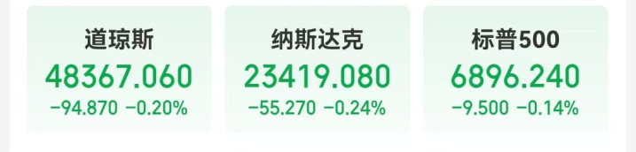当地时间12月30日,美股三大指数收盘均小幅下跌,纳指跌0.24%,道指跌0.20%,标普500指数跌0.14%。