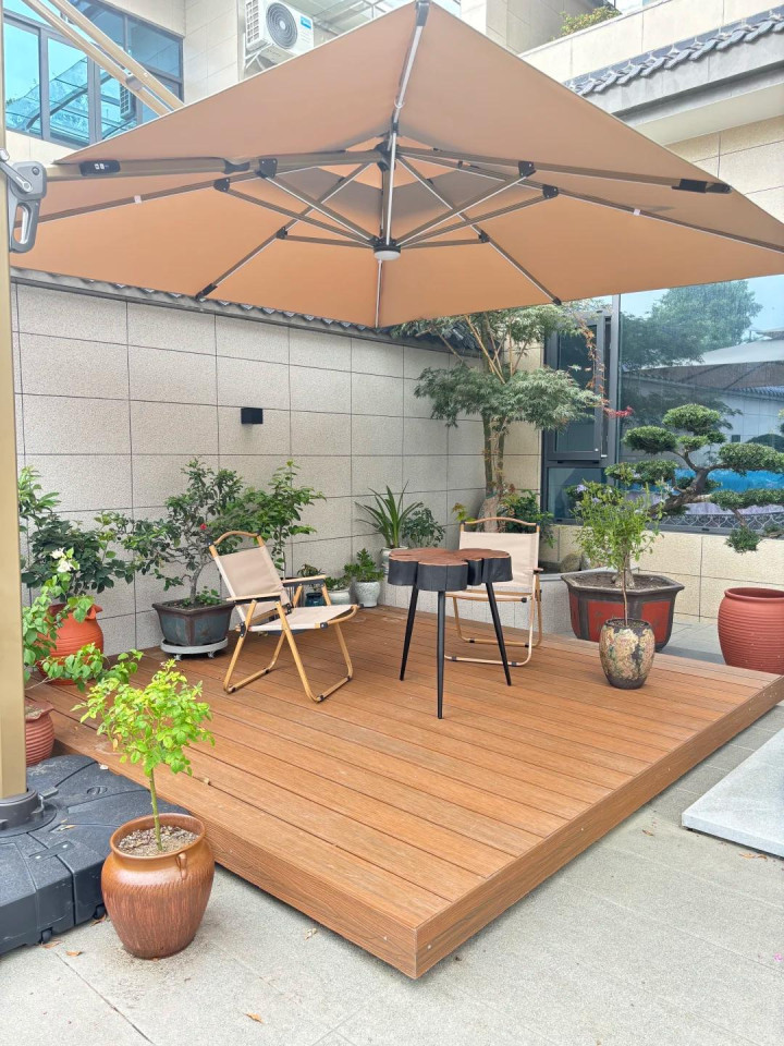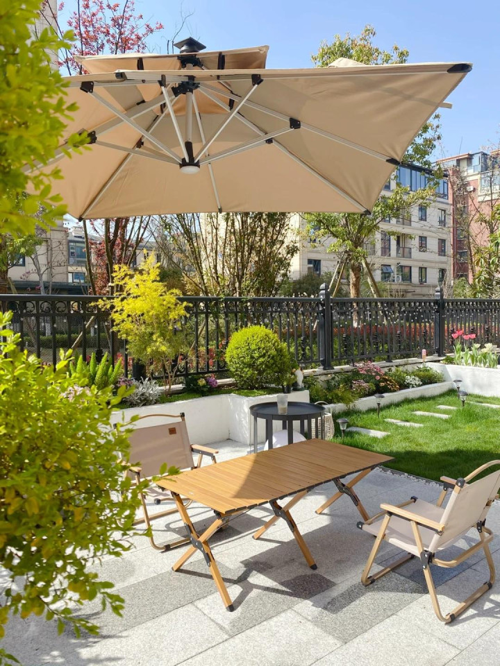 户外家具首选防腐木、铝合金、藤编,耐晒耐淋好打理。