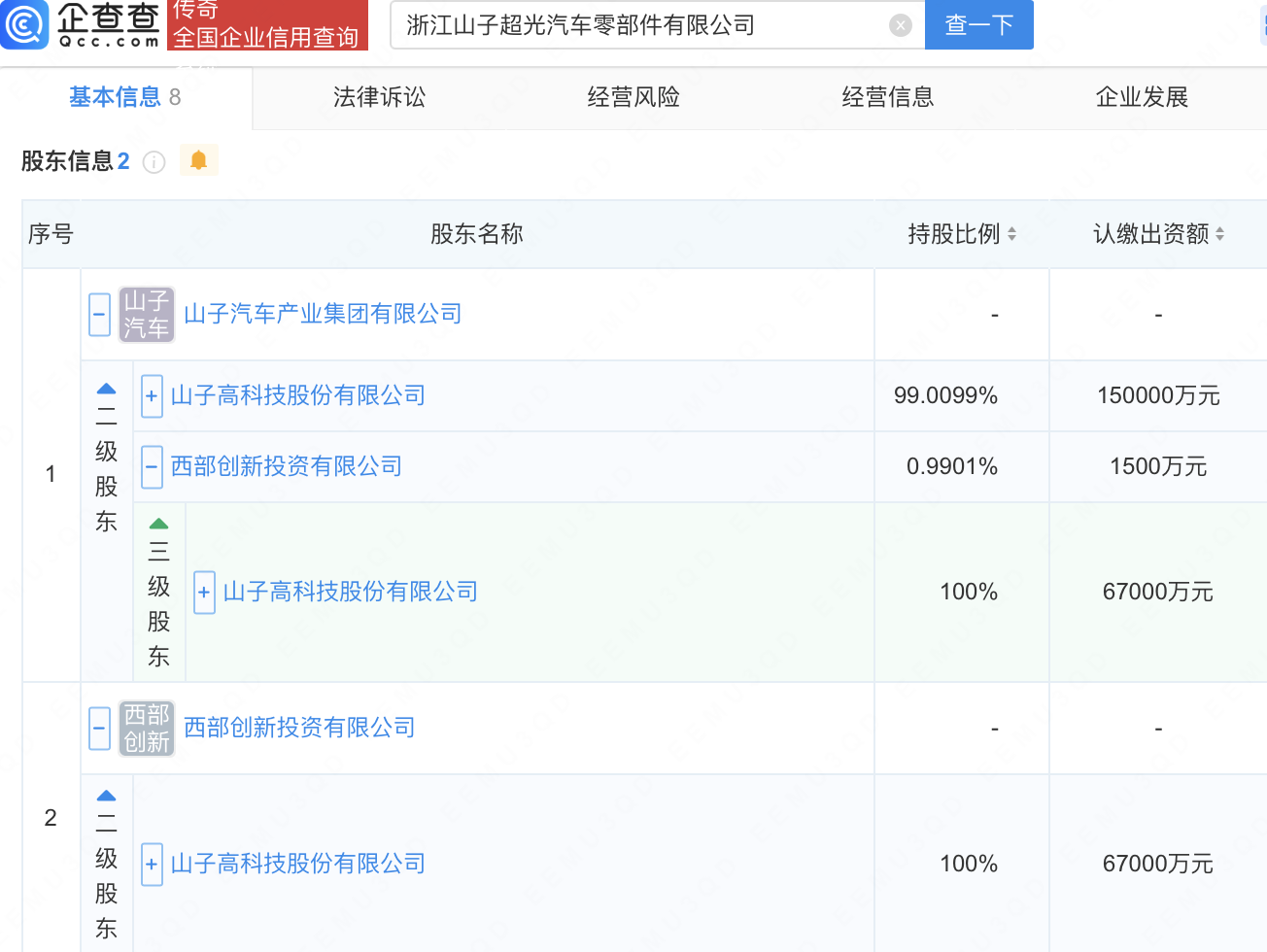 近日,浙江山子超光汽车零部件有限公司成立,注册资本1000万元,经营范围包含:汽车零部件研发;汽车零配件批发;新能源汽车电附件销售;电池销售等。企查查股权穿透显示,该公司由山子高科(000981)间接全资持股。